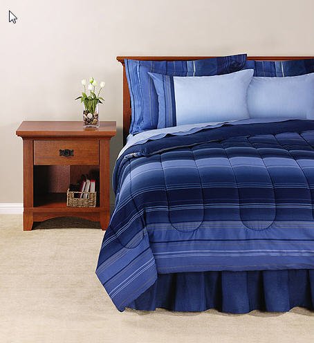 Update your bedroom Blue Stripe Bed in a Bag. You will love this bedding set whether you are sleeping, reading or lounging in your room. The set includes: 1- TWIN Size Comforter, 1- Flat Sheet, 1- Fitted Sheet, 1- Pillowcase, 1- Sham & 1- Bedskirt..../ Blue Striped Boys Adult Twin Comforter Set (6 Piece Bed In A Bag) / Teens Bedroom